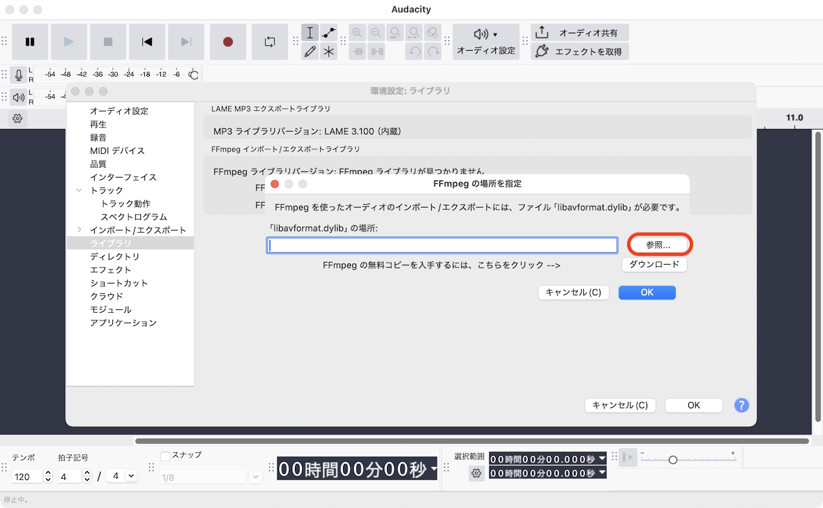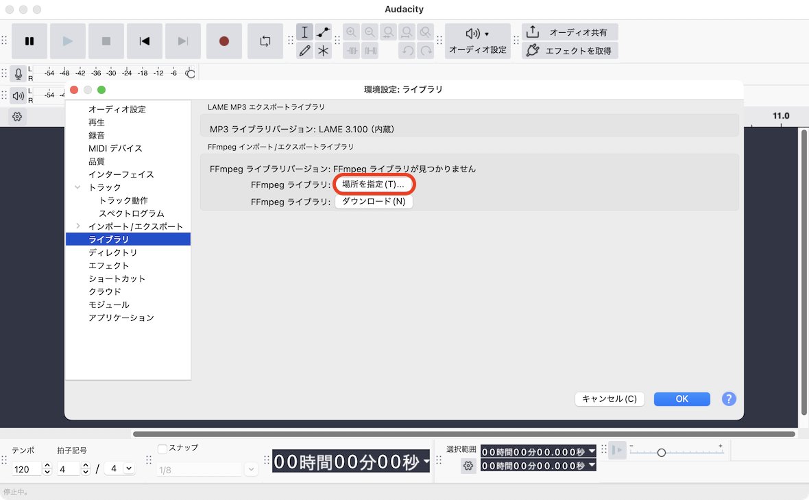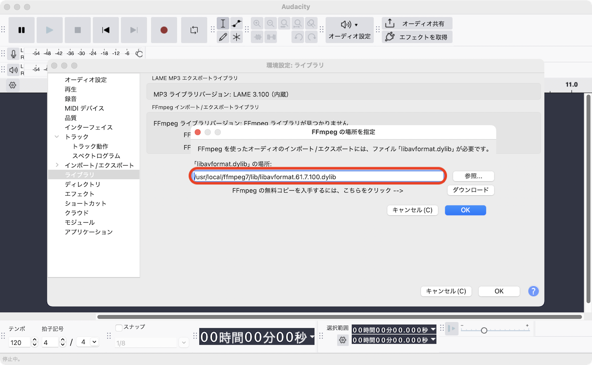 Audacityの環境設定(⌘+,)で、インストールしたffmpegライブラリ(libavformat.dylib)を指定する。(下のスクショ参照)