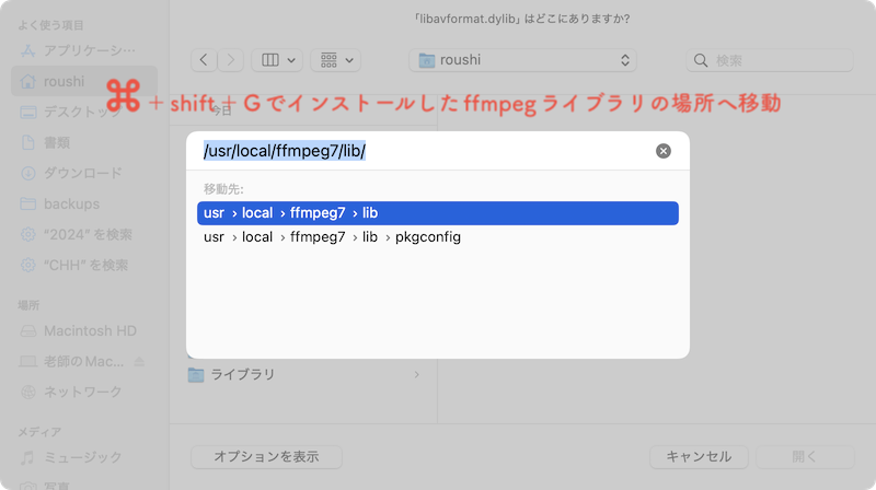 コンパイルするのは、ffmpeg7系の最新版である7.1.2(執筆時点)である。(ffmpeg8は利用不可!)cd ~/Desktop curl -LO https://ffmpeg.org/releases/ffmpeg-7.1.2.tar.xz tar xf ffmpeg-7.1.2.tar.xz cd ffmpeg-7.1.2 ./configure \ --prefix=/usr/local/ffmpeg7 \ --enable-shared \ --disable-programs \ --disable-doc make -j$(sysctl -n hw.ncpu) && sudo make install