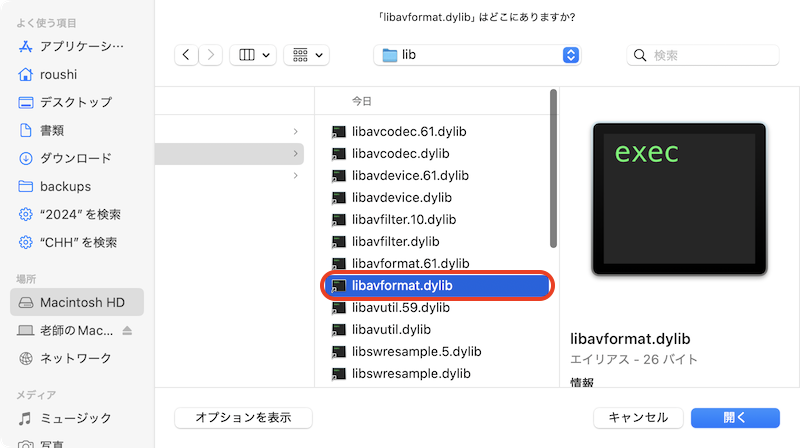 Mac版のAudacity用に配布されているffmpegライブラリは、いささか古く、ffmpegバージョン5(5.0.0)である。現在のffmpegバージョンは8系だから、3世代も前と言う事になる。